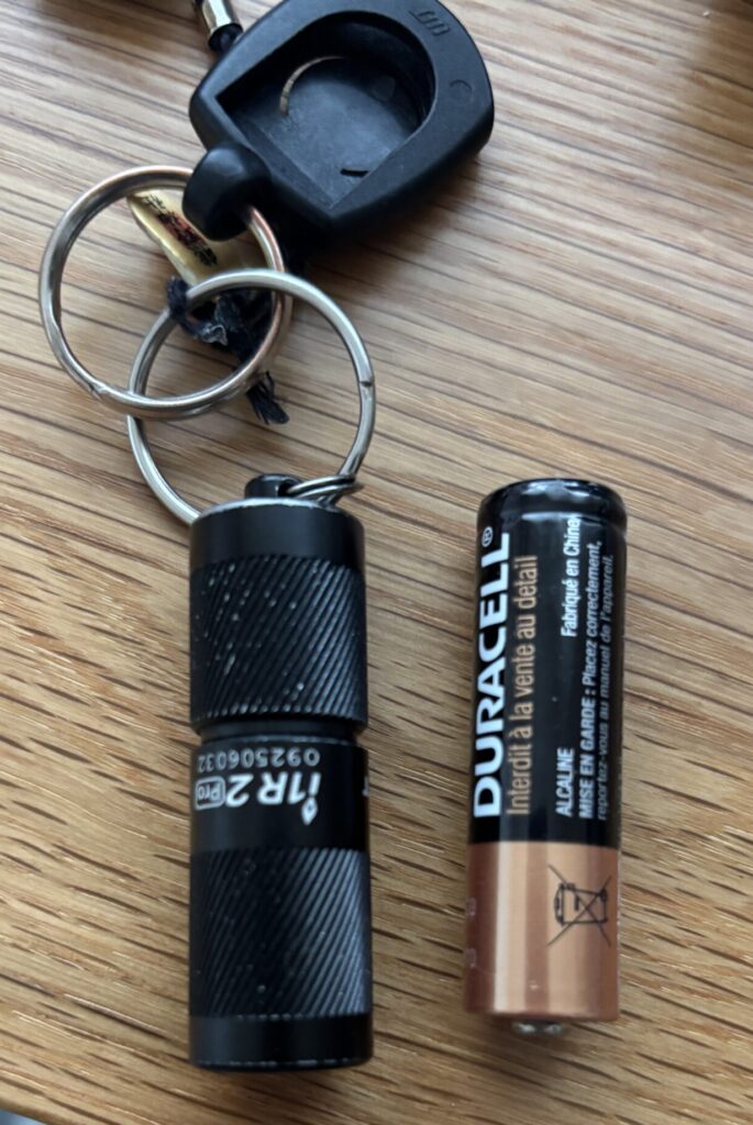私もこのようにキーホルダーにつけて毎日持ち歩いています。見ての通り単3電池並みのサイズ感。重さも実測21gでした。カルイ またUSB-Cで充電するので今や色々なところで充電可能。